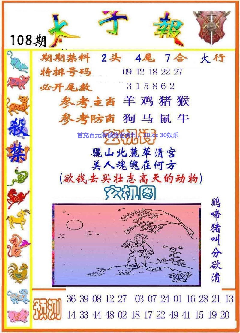 108期:驪山北麓华清宫,美人魂魄在何方 解:驪山北麓华清宫解地肖蛇羊鸡狗鼠虎 综合生肖:猪鼠猴蛇龙马 综合号码:19.31.18.30.10.22.13.25.14.26.24.36